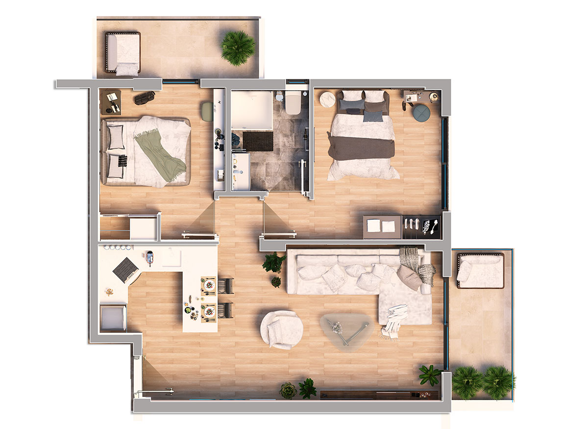 The 2+1 Infinity apartments feature two spacious bedrooms and a double balcony, perfect for families seeking ample terrace space and a private bedroom balcony. These apartments are available in four distinct blocks, allowing you to select the block layout that best fits your preferences and needs.