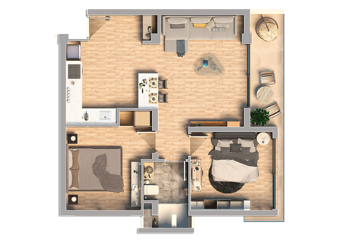 The 2+1 Premier Apartments offer two comfortable bedrooms and a spacious living area, providing the ideal setting for family living. These units are strategically situated within the River Corner and River Park blocks, offering a serene and convenient living experienc